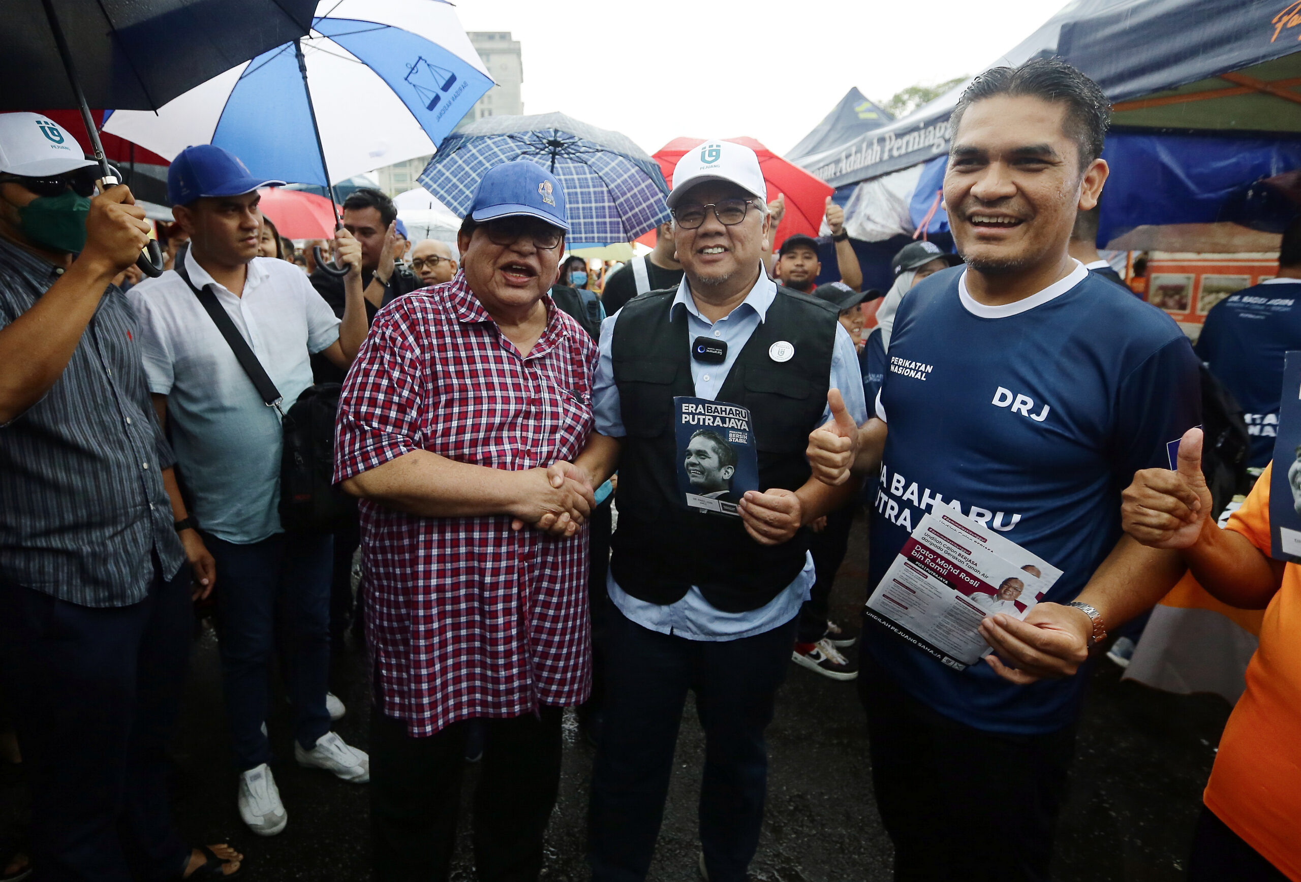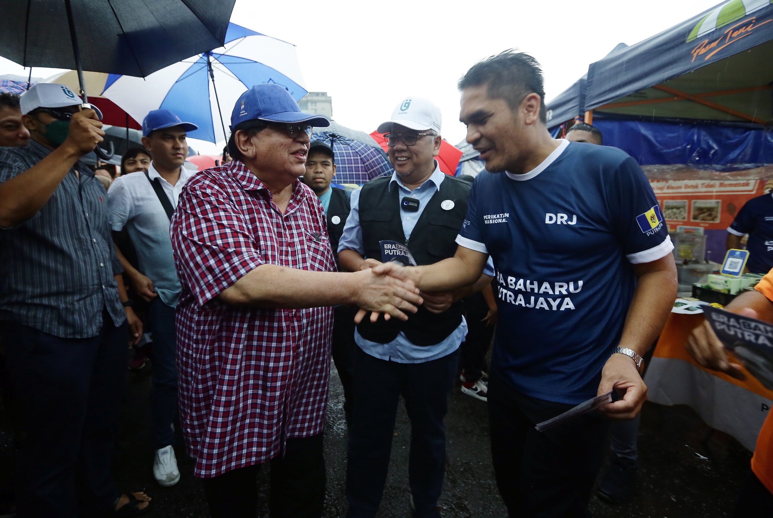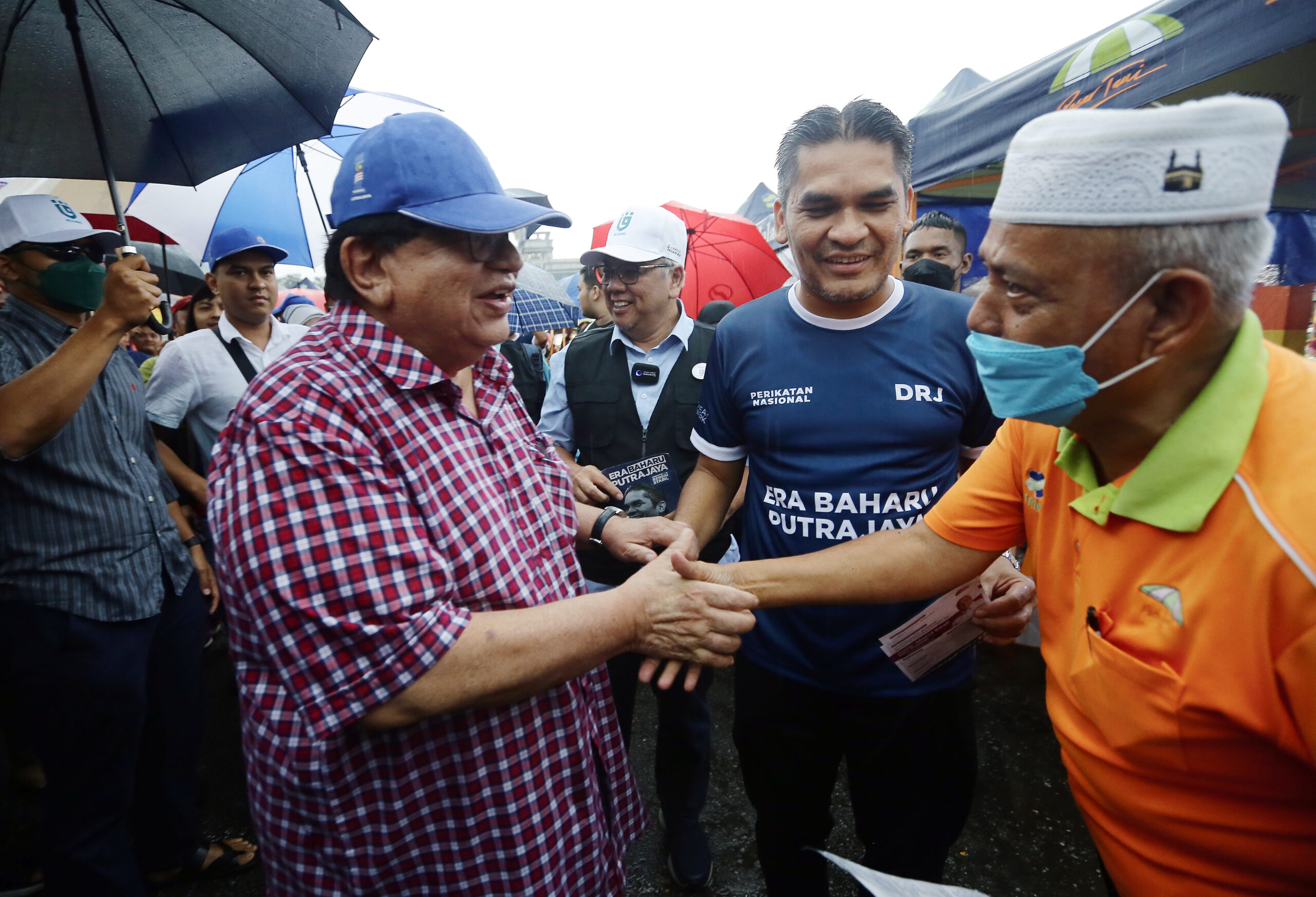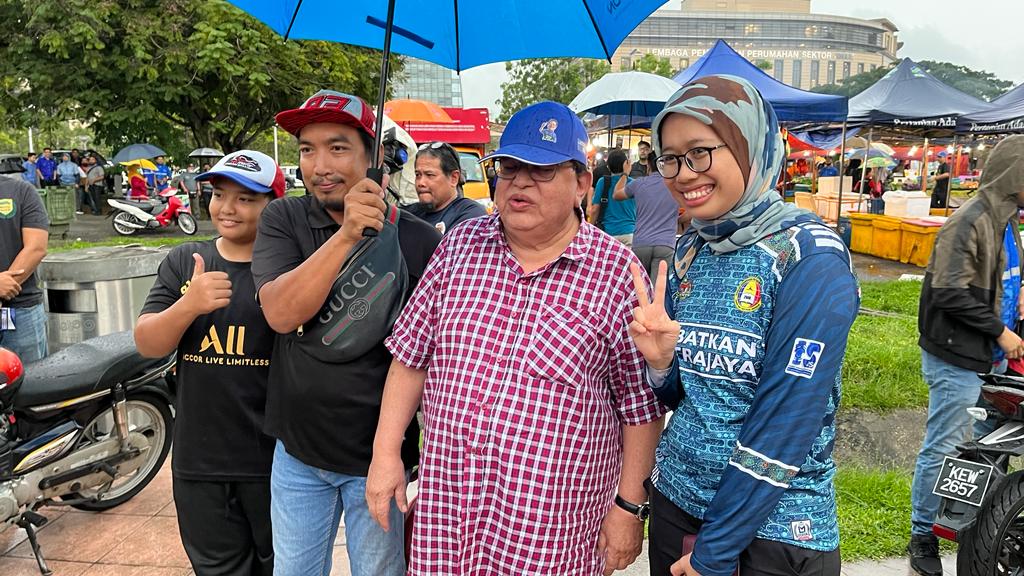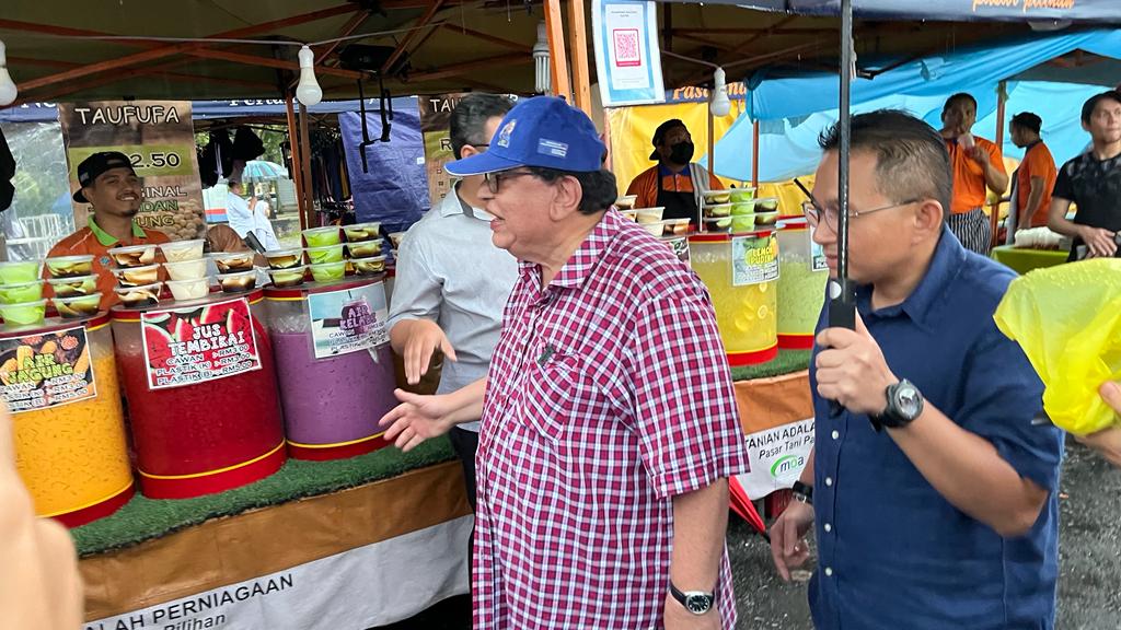 PUTRAJAYA 08 NOVEMBER 2022. Tiga calon Parlimen P125 Putrajaya, Datuk Seri Tengku Adnan Tengku Mansor (BN), Datuk Rosli Ramli (Pejuang) dan Datuk Dr Radzi Jidin (PN) bertemu ketika mengadakan kempen ‘walkabout’ di Pasar Tani Presint 2 Putrajaya. NSTP/MOHD FADLI HAMZAH