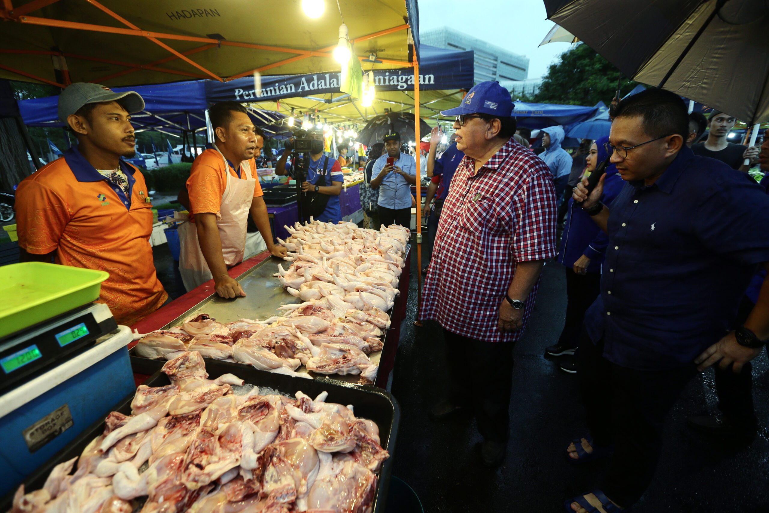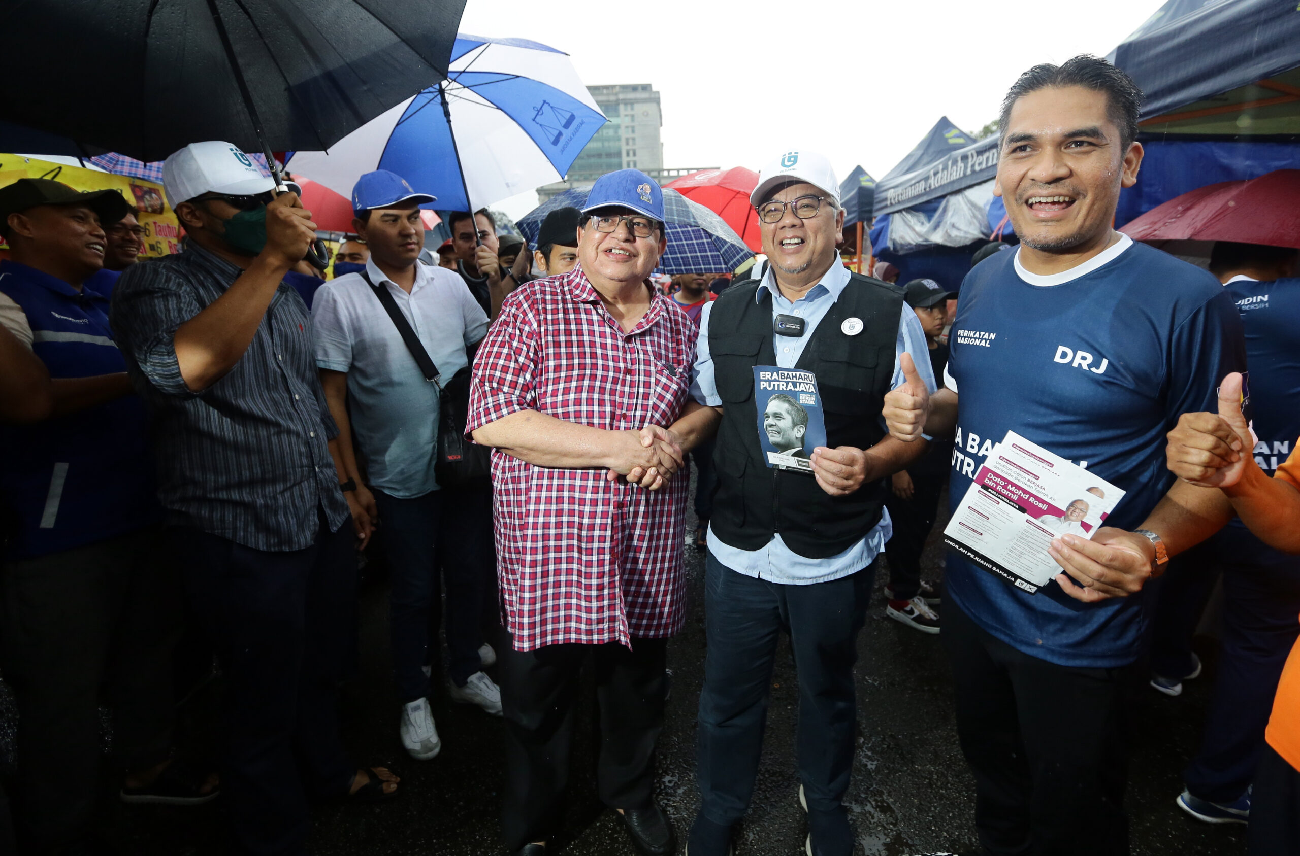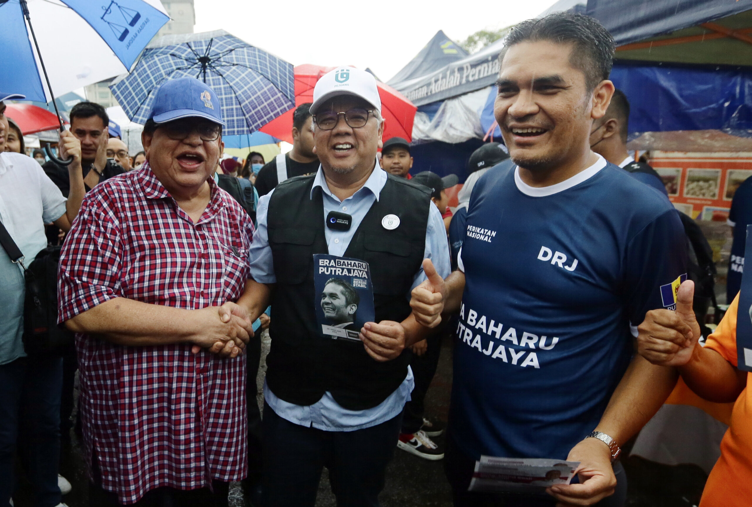 PUTRAJAYA 08 NOVEMBER 2022. Tiga calon Parlimen P125 Putrajaya, Datuk Seri Tengku Adnan Tengku Mansor (BN), Datuk Rosli Ramli (Pejuang) dan Datuk Dr Radzi Jidin (PN) bertemu ketika mengadakan kempen ‘walkabout’ di Pasar Tani Presint 2 Putrajaya. NSTP/MOHD FADLI HAMZAH